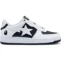 The A Bathing Ape Bape Sta Low #6 “Black” brings a timeless streetwear edge to the iconic silhouette. Crafted from premium black leather, the sneaker highlights the brand’s signature STA logo overlay in matching black for a sleek, tonal finish. Perforations on the toe box add breathability, while a padded collar and cushioned midsole ensure everyday comfort. Set atop a durable rubber outsole with classic court-inspired traction, the design is completed with BAPE branding on the tongue, heel, and sole, making it a versatile staple with bold urban style.