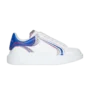 The Alexander McQueen Oversized Sneaker “Curve Tech – Blue Red” reimagines the brand’s signature silhouette with a bold, color-blocked, tech-inspired design. It features a smooth white leather upper contrasted by a blue and red heel tab, stamped with the Alexander McQueen logo in metallic. The sneaker sits on a curved, sculpted oversized rubber midsole, giving it a futuristic, elevated profile. Flat white laces, a padded collar, and a rounded toe maintain the clean, minimalist structure. Handcrafted in Italy, this design blends contemporary innovation with luxurious craftsmanship and striking color detail.