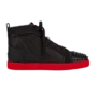 The Christian Louboutin Lou Spikes Orlato Flat “Black Red” reimagines the classic high-top sneaker with the brand’s bold, edgy aesthetic. The upper is constructed from smooth black leather and tonal suede panels, accented with signature metallic spike embellishments across the toe for a striking look. Vibrant red detailing at the heel and trim adds contrast and energy, while flat laces, a padded collar, and leather lining ensure a comfortable fit. The sneaker sits on a clean white rubber sole, finished with Christian Louboutin’s iconic red outsole, merging streetwear attitude with luxury craftsmanship.