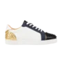 The Christian Louboutin Seavaste 2 Orlato Flat “Navy Gold” is a luxurious low-top sneaker that combines rich tones with signature detailing. The upper features a mix of navy suede and mesh panels, accented by metallic gold leather overlays that add a refined contrast. Iconic spike embellishments at the toe bring a bold edge, while a lace-up front and padded collar deliver comfort and secure wear. Set on a durable white rubber sole with the brand’s signature red outsole, this sneaker balances sporty versatility with Louboutin’s high-fashion aesthetic.