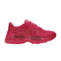 The Gucci Rhyton ‘Pink’ is a bold reinterpretation of the brand’s signature chunky sneaker, presented in a striking monochrome pink leather upper. Its oversized silhouette embraces retro 1990s influences, balanced with Gucci’s modern luxury detailing. The shoe is set on a sculpted tonal rubber sole that enhances comfort and durability, while padded collars and leather lining ensure a premium fit. Minimal branding and tonal stitching allow the vivid colorway to take center stage, making this pair a standout statement sneaker within the Rhyton lineup.