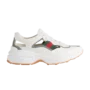 The Gucci Rhyton Cut Out ‘White’ is a contemporary reinterpretation of the brand’s iconic chunky sneaker. Crafted from premium white leather, the design features strategically placed cut-out panels that add a modern, airy aesthetic while maintaining structure. The signature oversized rubber sole provides cushioning, height, and the classic “dad shoe” silhouette. Additional details include padded collars, tonal stitching, and Gucci branding on the tongue and heel, balancing streetwear-inspired styling with luxury craftsmanship. This model delivers a bold, fashion-forward statement while retaining versatility for everyday wear.